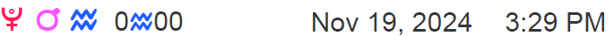 In the above example, Pluto enters Aquarius (depicted as conjunct the Aquarius sign) at 0 degrees Aquarius 00 minutes on November 19th, 2024, at 3:29 PM EST.