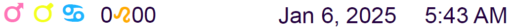In the above example, Mars re-enters Cancer in retrograde motion (depicted as conjunct the Cancer sign) from 0 degrees Leo 00 minutes on January 6th, 2025, at 5:43 AM EST. This one is a little different since Mars is moving backward from the Leo sign to Cancer.