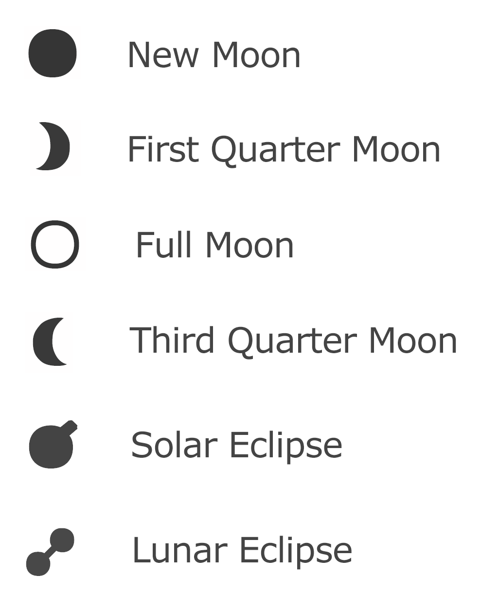 - four major lunar phases (New Moon, First Quarter Moon, Full Moon, and Last Quarter Moon), and