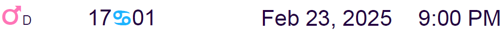 In the above example, Mars turns direct (D) at 17 Cancer 01 on February 23rd, 2025, at 9:00 PM EST.