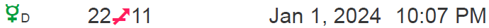 In the above example, Mercury turns direct (D) at 22 degrees Sagittarius and 11 minutes on January 1st, 2024, at 10:07 PM EST.