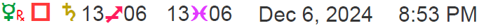 In the above example, Mercury is retrograde but not Saturn. Here, retrograde Mercury at 13 Sagittarius 06 forms a square to Saturn at 13 Pisces 06 on December 6th, 2024, at 8:53 PM EST.