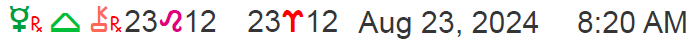 In the above example, retrograde Mercury at 23 Leo 12 forms a trine to retrograde Chiron at 23 Aries 12 on August 23rd, 2024, at 8:20 AM EDT.