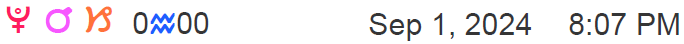 In the above example, Pluto re-enters Capricorn in retrograde motion (depicted as conjunct the Capricorn sign) from 0 degrees Aquarius 00 minutes on September 1st, 2024, at 8:07 PM EST. This one is a little different since Pluto is moving backward from the Aquarius sign to Capricorn.