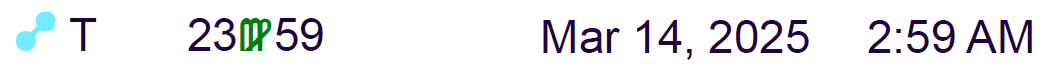 In the above example, a Total Lunar Eclipse occurs at 23 degrees Virgo 59 on March 14th, 2025, at 2:59 AM EDT.