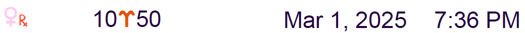 In the above example, Venus turns retrograde (Rx) at 10 Aries 50 on March 1st, 2025, at 7:36 PM EST.