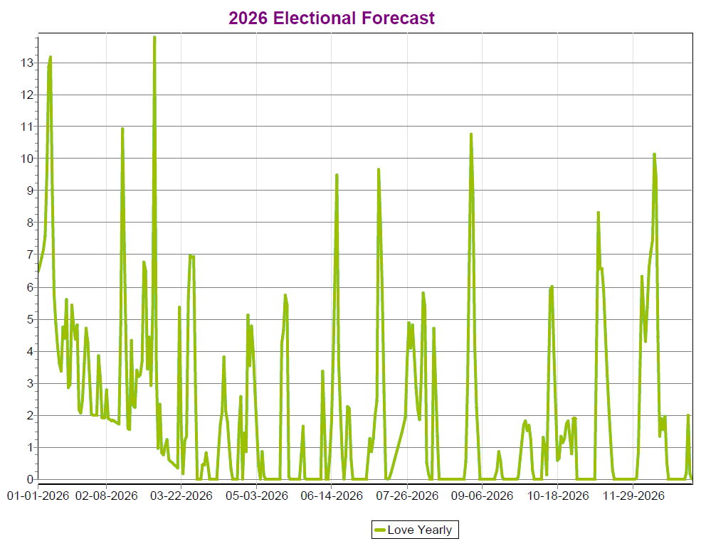 What are the better times for love in 2026? The following electional astrology graph shows dates when we can be especially open to love and romantic feelings or commitments.