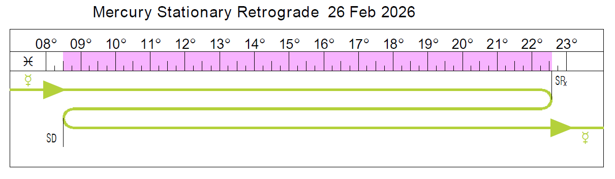 | Feb 26 | 1:48 AM | Mercury Retrograde | Mer 22 Pis 34'Rx |