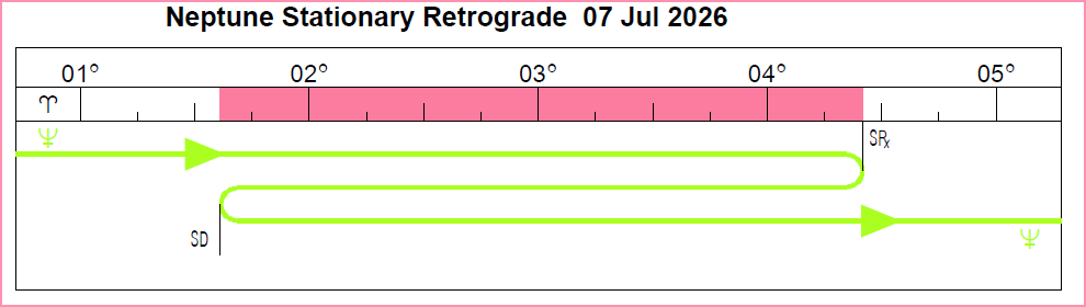 Neptune transits/spans the following degrees in 2026: 29° Pisces 31′ to 4° Aries 25′