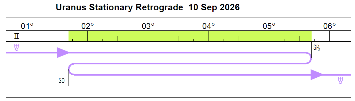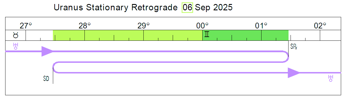 Uranus transits/spans the following degrees in 2026: 27° Taurus 28′ to 5º Gemini 42′
