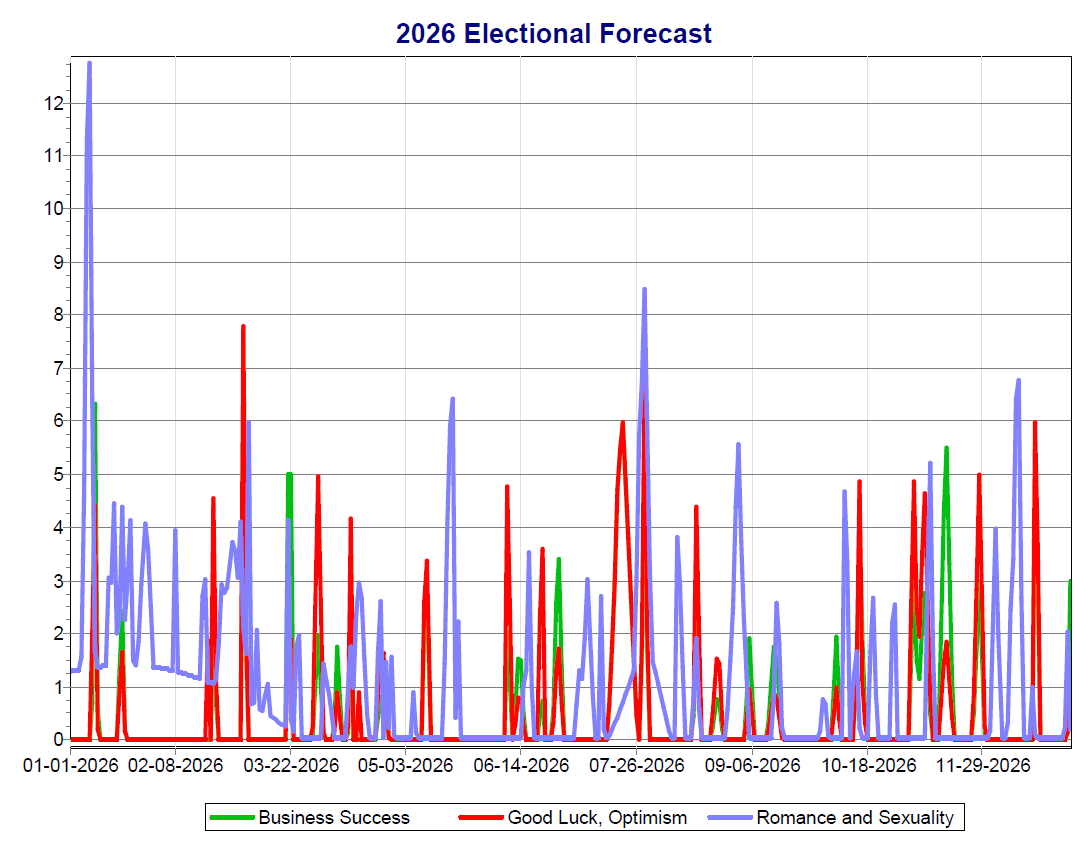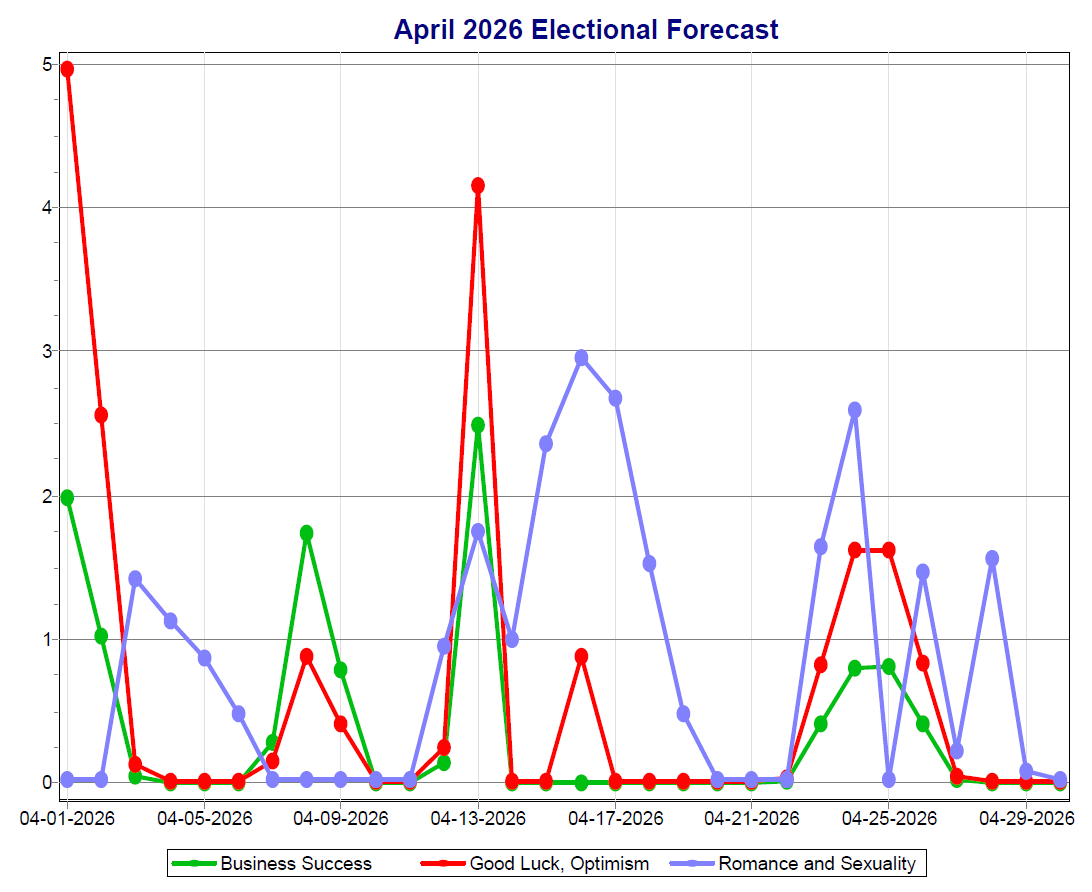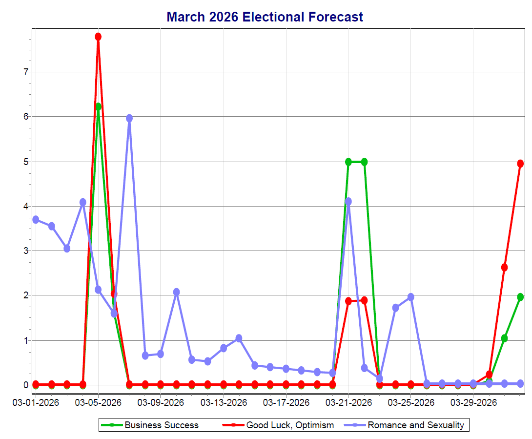 The higher the value, the more transits that favor the different categories that are happening on a given date. So, for example, in the March 2026 graph above, the highest score for Romance & Sexuality (blue line) is on the 7th, for Good Luck & Optimism (red line) is on the 5th, and for Business Success (green line), it’s on the 5th.