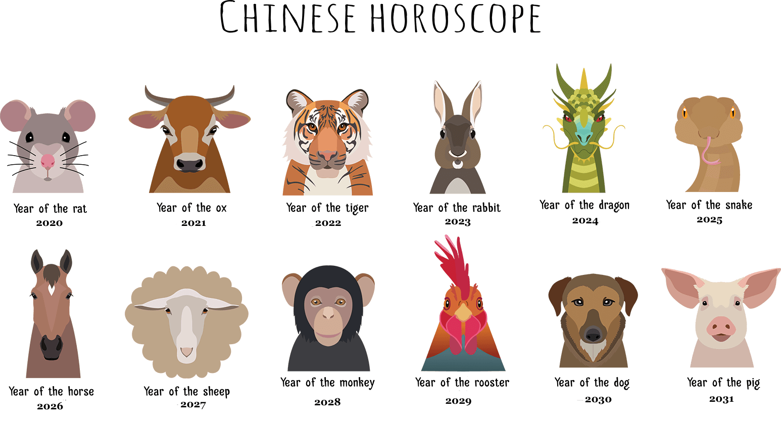 Each of the 12 years of the Chinese lunar calendar is named after an animal. These are Rat, Ox, Tiger, Rabbit, Dragon, Snake, Horse, Goat, Monkey, Rooster, Dog, and Pig.