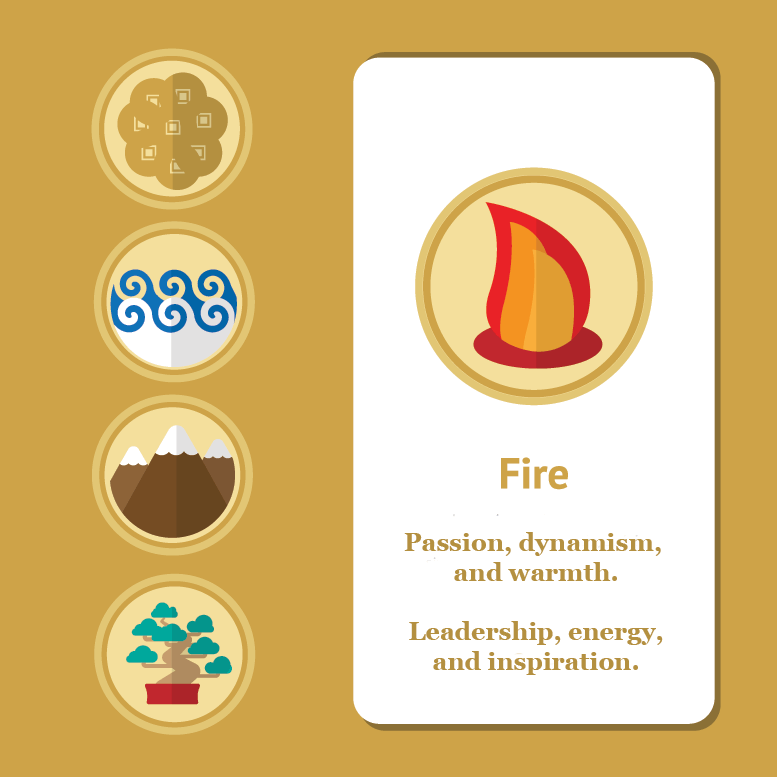 Fire creates Earth, and Wood creates Fire. Water destroys Fire, and Fire destroys Metal. As such, Fire is in good shape with Earth and Wood, and is in difficult relationship with Water and Metal.