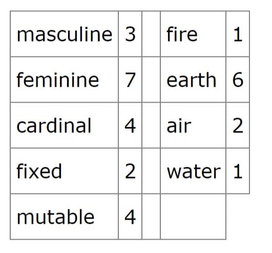 In the example above, the distribution of planets/points in the elements has a clearly dominant element: Earth. This is not always the case. It may also be more telling if we assign the Sun, Moon, and Ascendant, and perhaps Mercury, Venus, and Mars, a higher value than the outer planets since they are more personal points. In other words, if the Sun and Moon are of the Air element, for example, and nothing else is, the Air element would still be considered very strong since the Sun and Moon are so personal to the native.