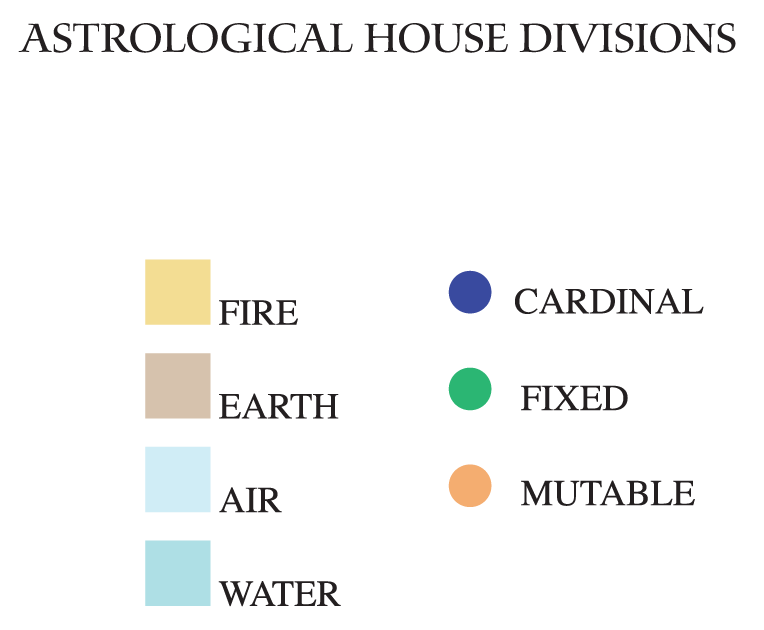 Above is a legend of the signs showing their Elements (also known as Triplicities) and Qualities/Modes (also known as Quadruplicities). Keep in mind that each zodiac sign shares an element and quality (or mode) with other signs, but none share both an element and quality with another sign.