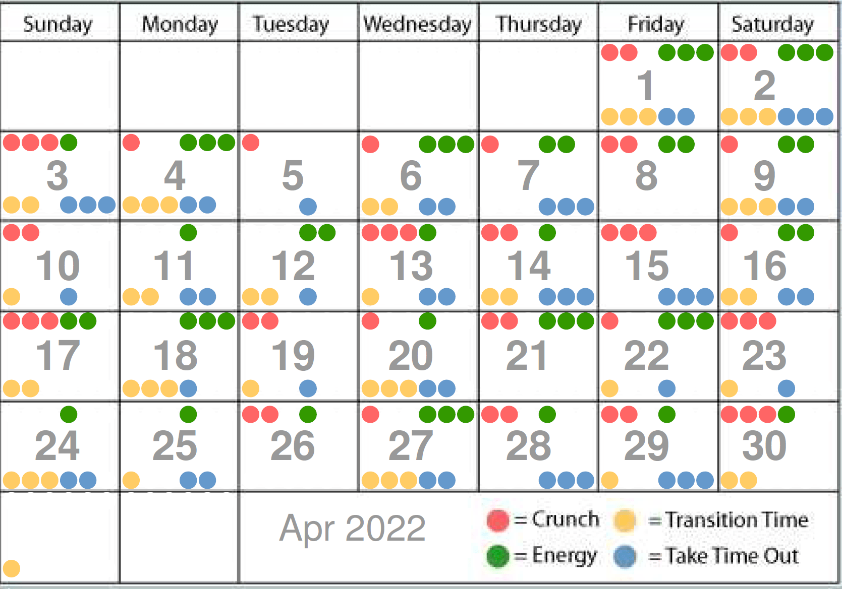 Best and worst days for taking action or holding back. Red dots mean it’s crunch time –there’s likely to be some stress on that day, and the more red dots, the tenser it’s likely to be. It’s an impulsive time. Green dots suggest ease and flow. Yellow dots mean things are in transition, and blue dots suggest it’s better to take time out. Better days for new initiatives have mostly green dots.