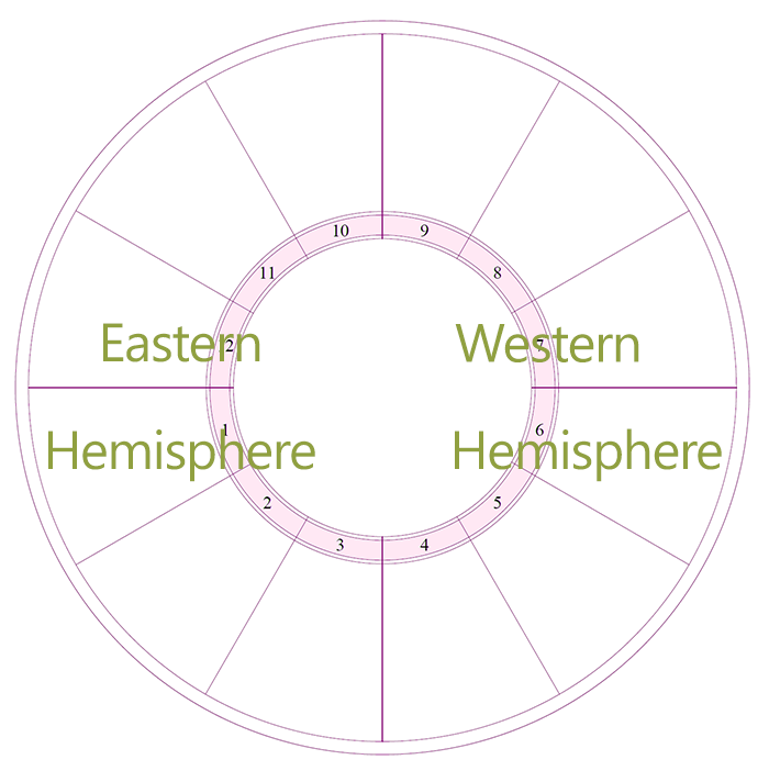 The Eastern Hemisphere is comprised of the first 3 and the last 3 houses—in other words, Houses 1, 2, 3, 10, 11, and 12. It is the half of the chart that is on the left.