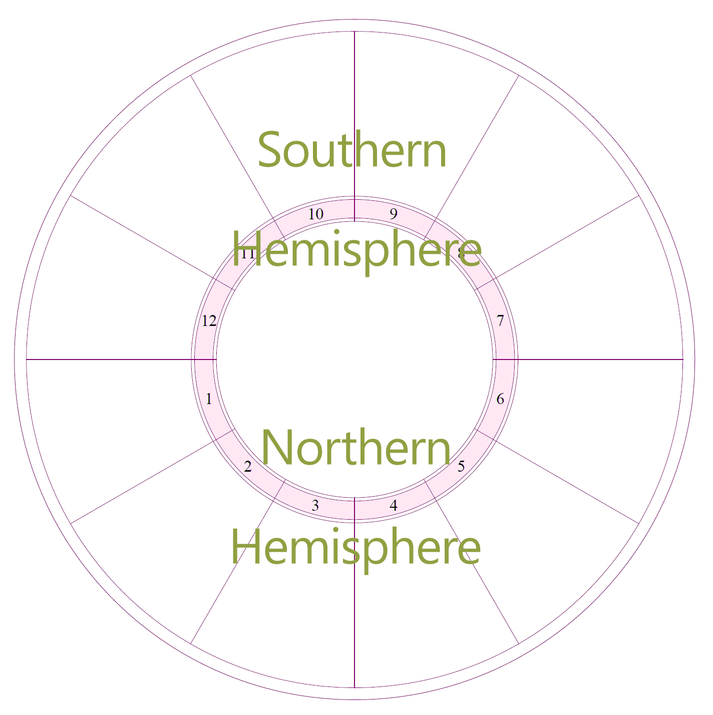 There are four hemispheric divisions of the chart—Northern, Southern, Eastern, and Western. They’re slightly tricky to remember because their positions are counter-intuitive!