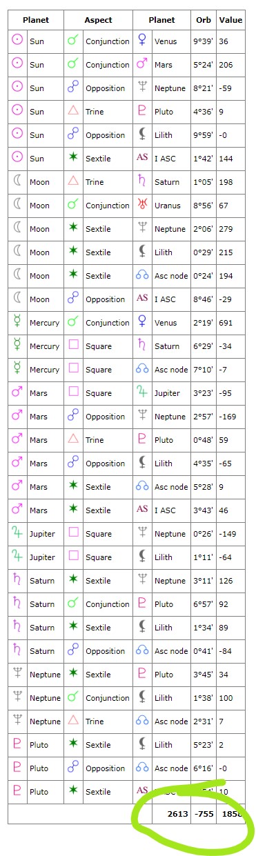 While the orb is a mathematical value, the value score is a subjective one. Not any one particular aspect can be considered wholly “bad” or “good” since a person can work with its energies in constructive or destructive ways. Some aspects are typically easier to manage and others present a challenge or struggle.