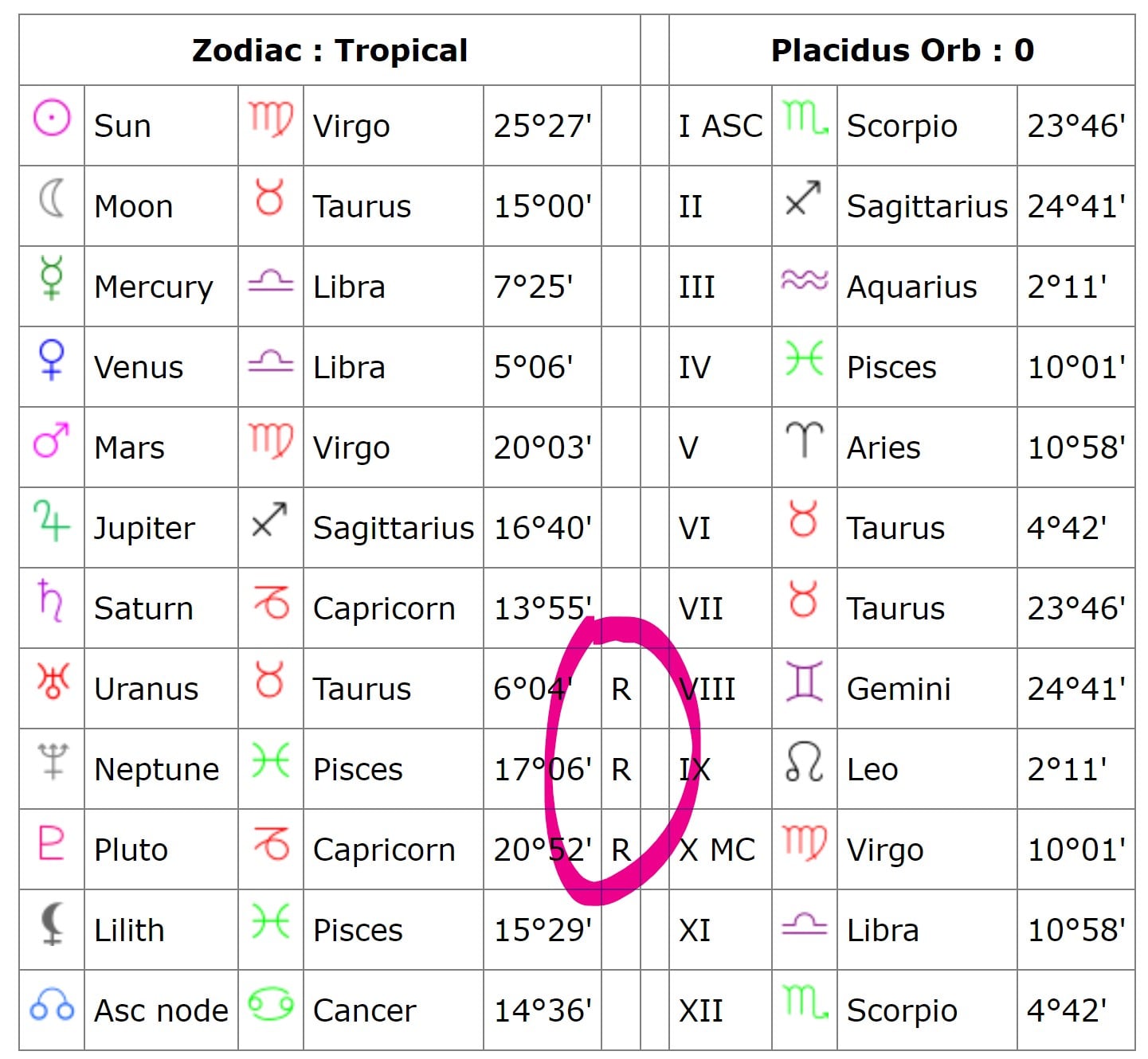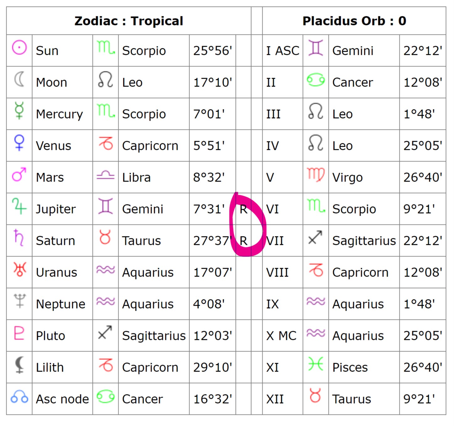 In the above, Jupiter and Saturn are retrograde. The other listed points, up until Pluto, are NOT retrograde if there is no “R” next to them. Note that the Sun, Moon, and Ascendant cannot be (never are) retrograde. Black Moon Lilith is the Mean value of the point (there are multiple bodies called Lilith in astrology). The True North Node is frequently retrograde but its retrograde is not useful to note so it’s not listed here.