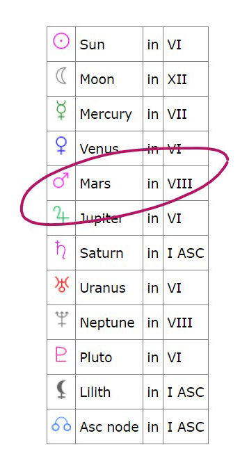 Pictured above is a table of the house positions of planets or planets in houses. For example, circled above is Mars in VIII which means that, in this chart, Mars is in the 8th house. This factor is listed and interpreted in the interpretive report on the same page, as are all other factors listed in this table.