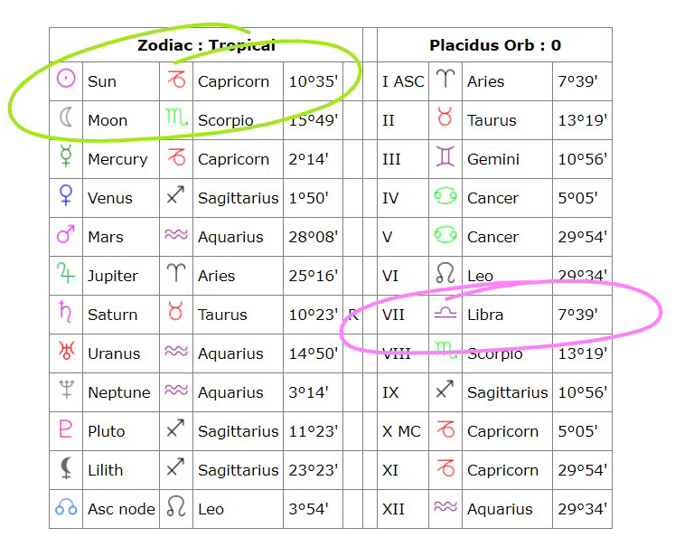 Above, on the left side of the table, you’ll find the listing of planets in the natal chart and their positions by sign and degree. Circled in green, for example, is the position of the Sun. Here we see the Sun is in Capricorn at 10 degrees and 35 minutes.