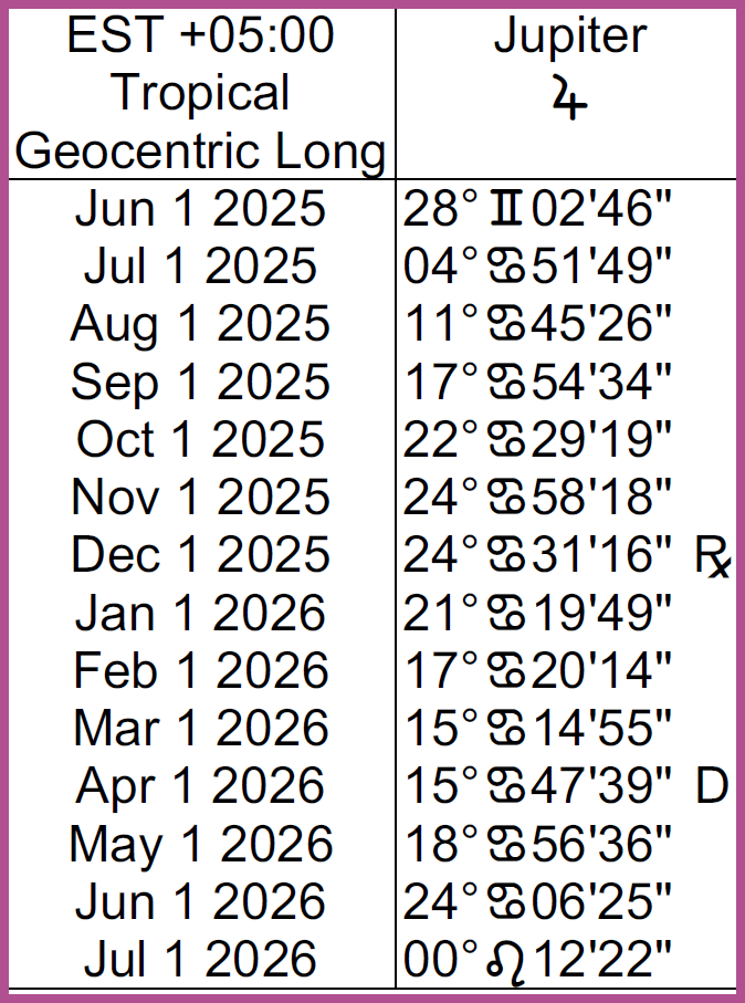 Aspects Jupiter Forms while transiting the sign of Cancer in 2025 and 2026.