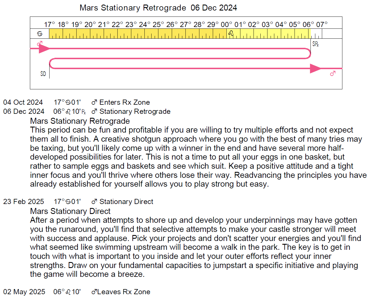 Details: December 6th, 2024 — Mars turns retrograde at 6 degrees Leo 10′ and is retrograde until February 23rd, 2025, at 17 degrees Cancer 01′.