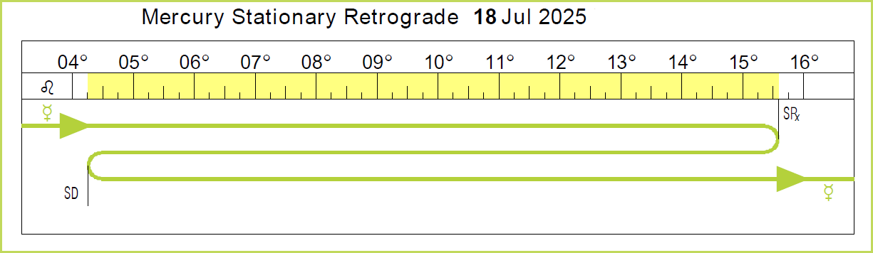 - On July 18, 2025, Mercury stations and turns retrograde at 15° Leo 35’Rx