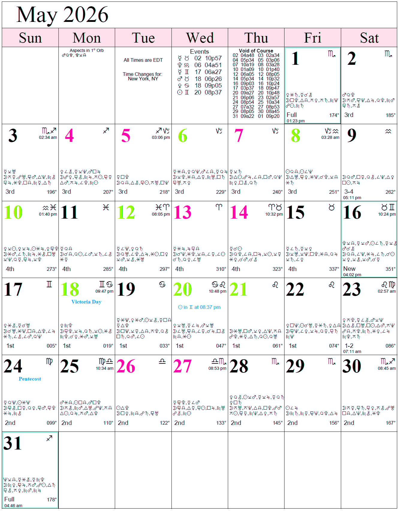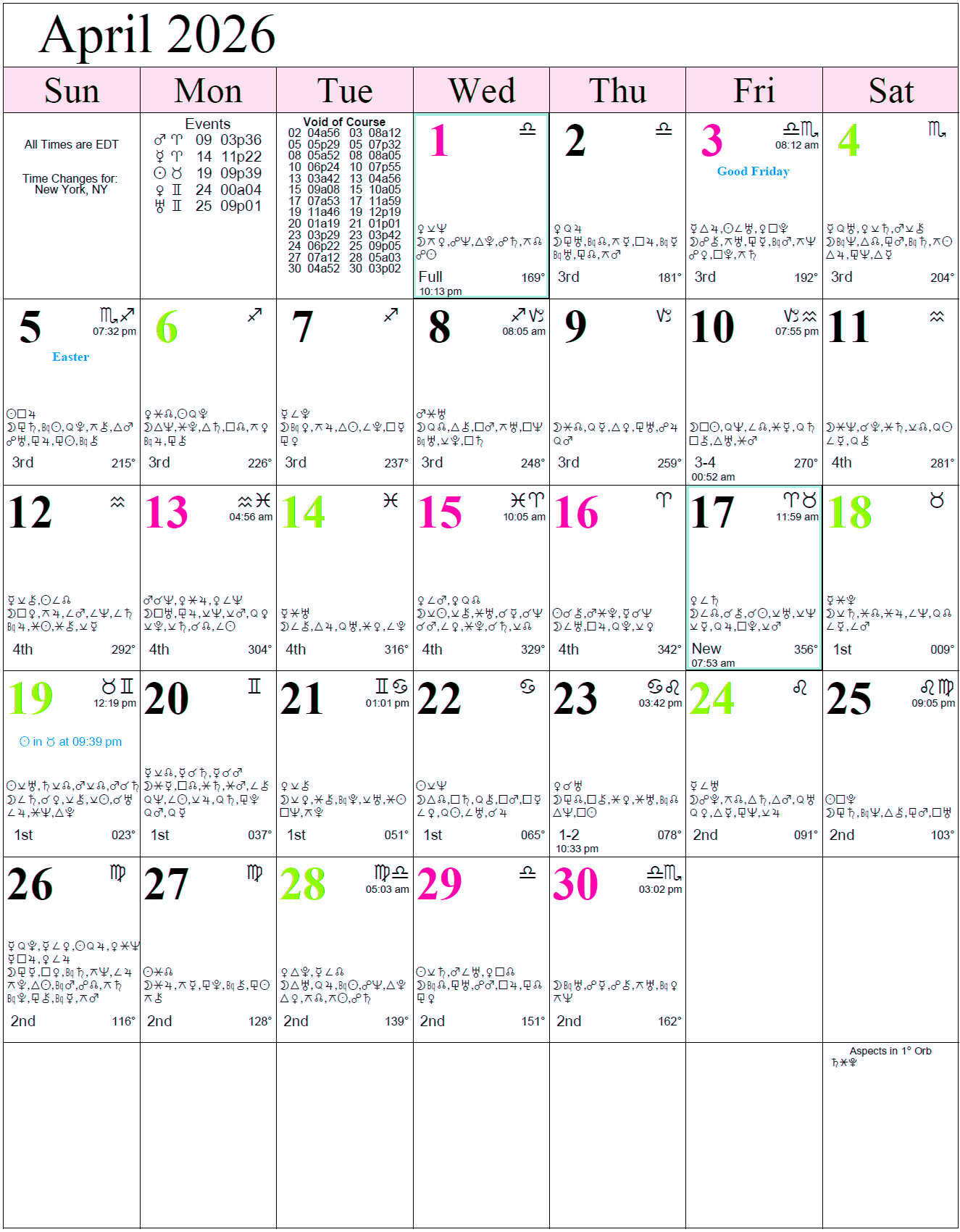 The following is the current monthly calendar complete with astrological information, including planetary aspects, void of course Moon data, and Moon signs. Note: Time is Eastern Time (Daylight Savings Time is observed when in effect).