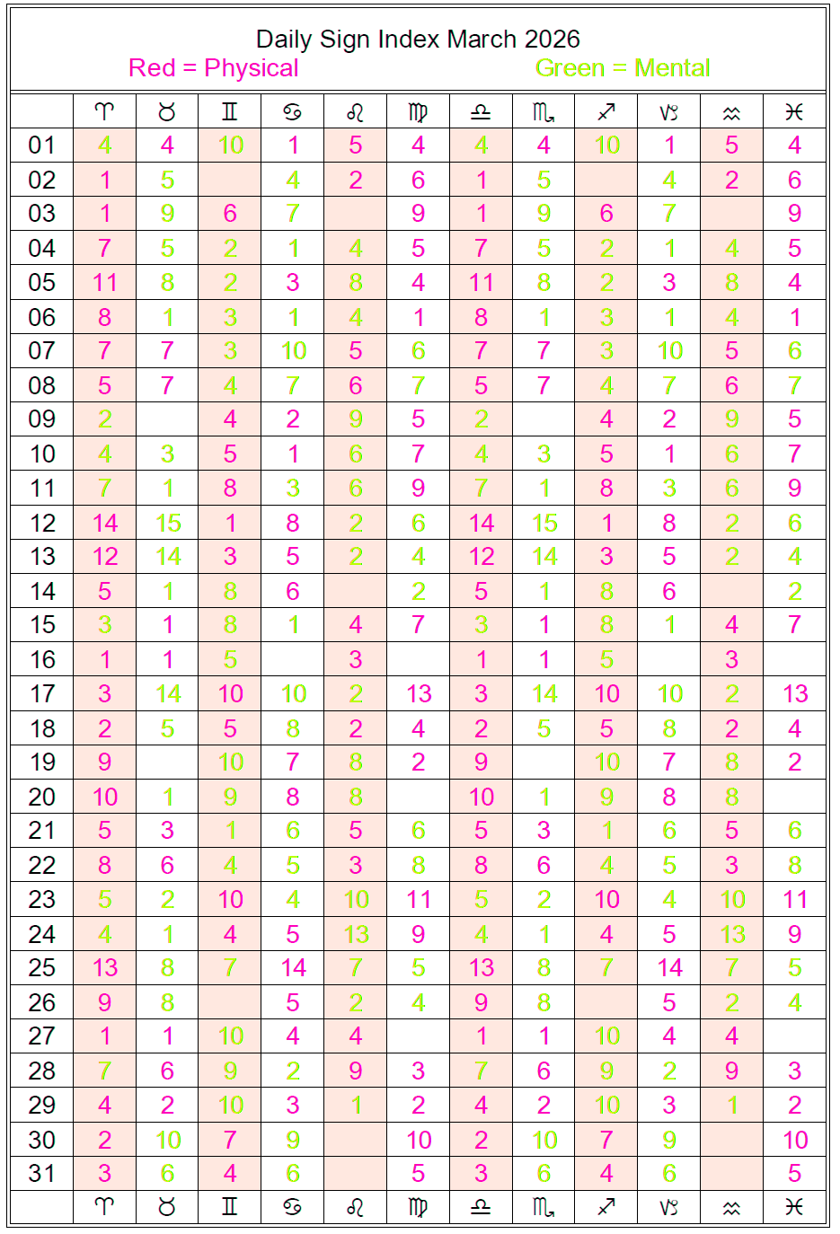 Find your Sun Sign in the bar across the top, and scroll down the column until you reach today’s date (listed along the left side of the table). The number in the box indicates where your strengths are for the day. If it is a red-pink number, then you can expect to have physical energy today. If it is a green number, you can expect to have more mental energy (rather than physical). The higher the number the greater the impact. Red days are more inclined to be challenging and possibly stressful, while green days tend to be easier.