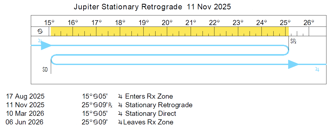 - Jupiter stations and turns retrograde on November 11, 2025, at 25° Cancer 09′ Rx