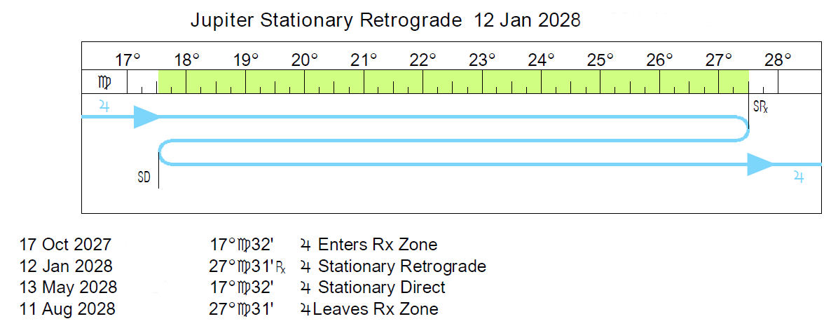 - Jupiter enters retrograde zone/shadow on November 15, 2028, at 17° Libra 30′