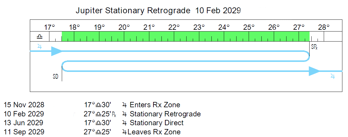 - Jupiter stations and turns retrograde on February 10, 2029, at 27° Libra 25′ Rx