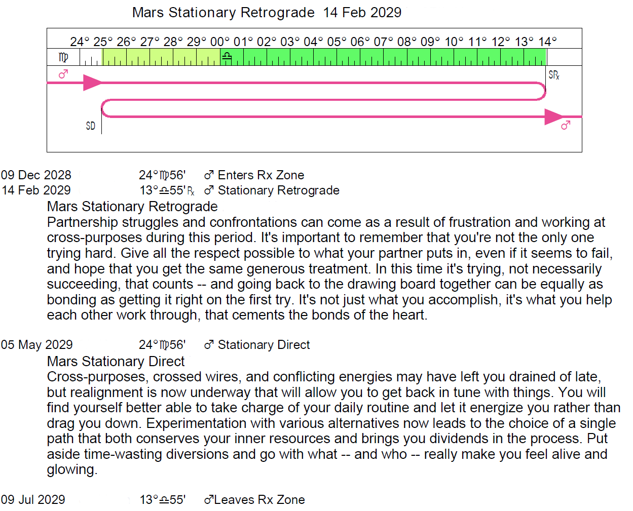 - On February 14, 2029, Mars stations and turns retrograde at 13° Libra 55’Rx