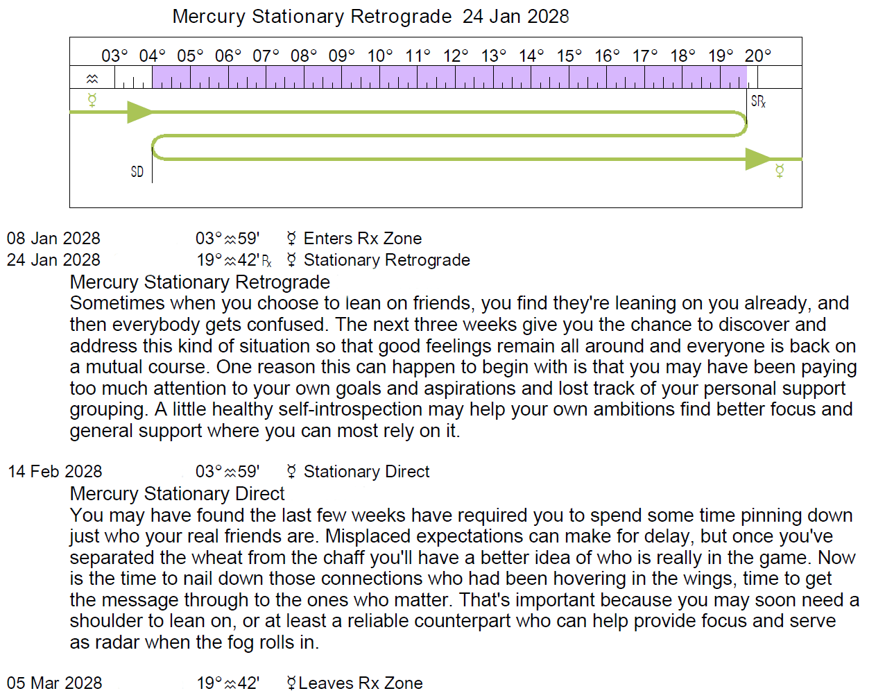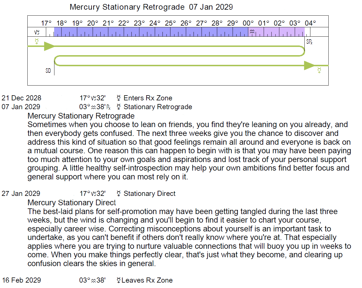 - On January 7, 2029, Mercury stations and turns retrograde at 3° Aquarius 38′ Rx