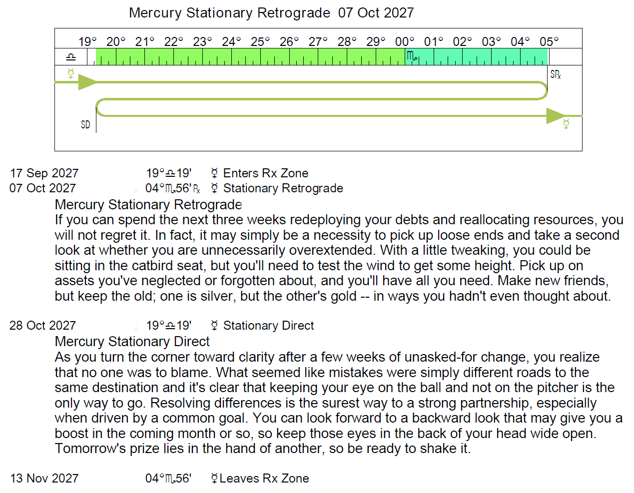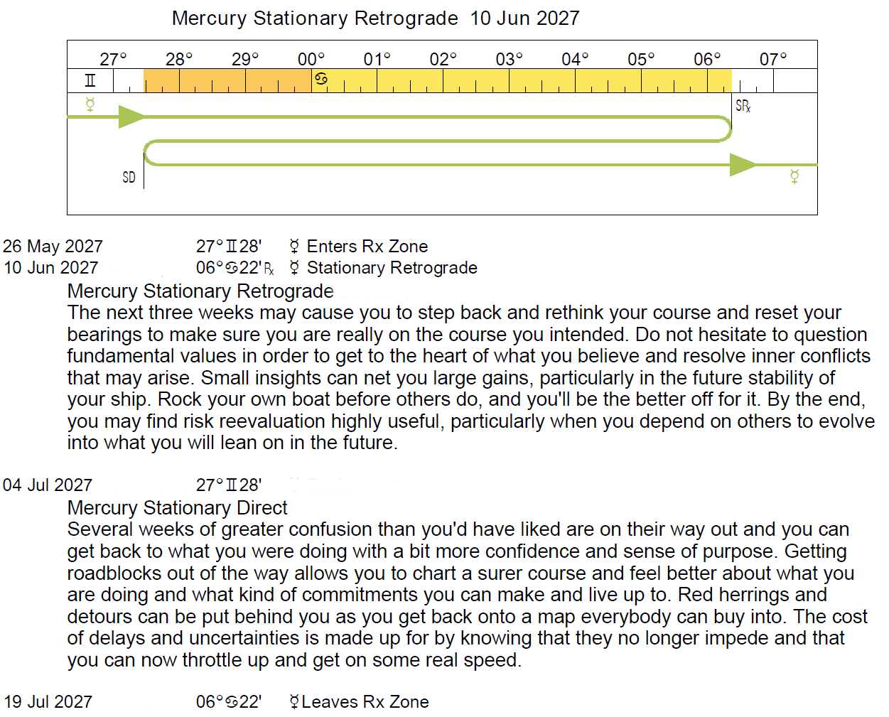 - On June 10, 2027, Mercury stations and turns retrograde at 6° Cancer 22’Rx