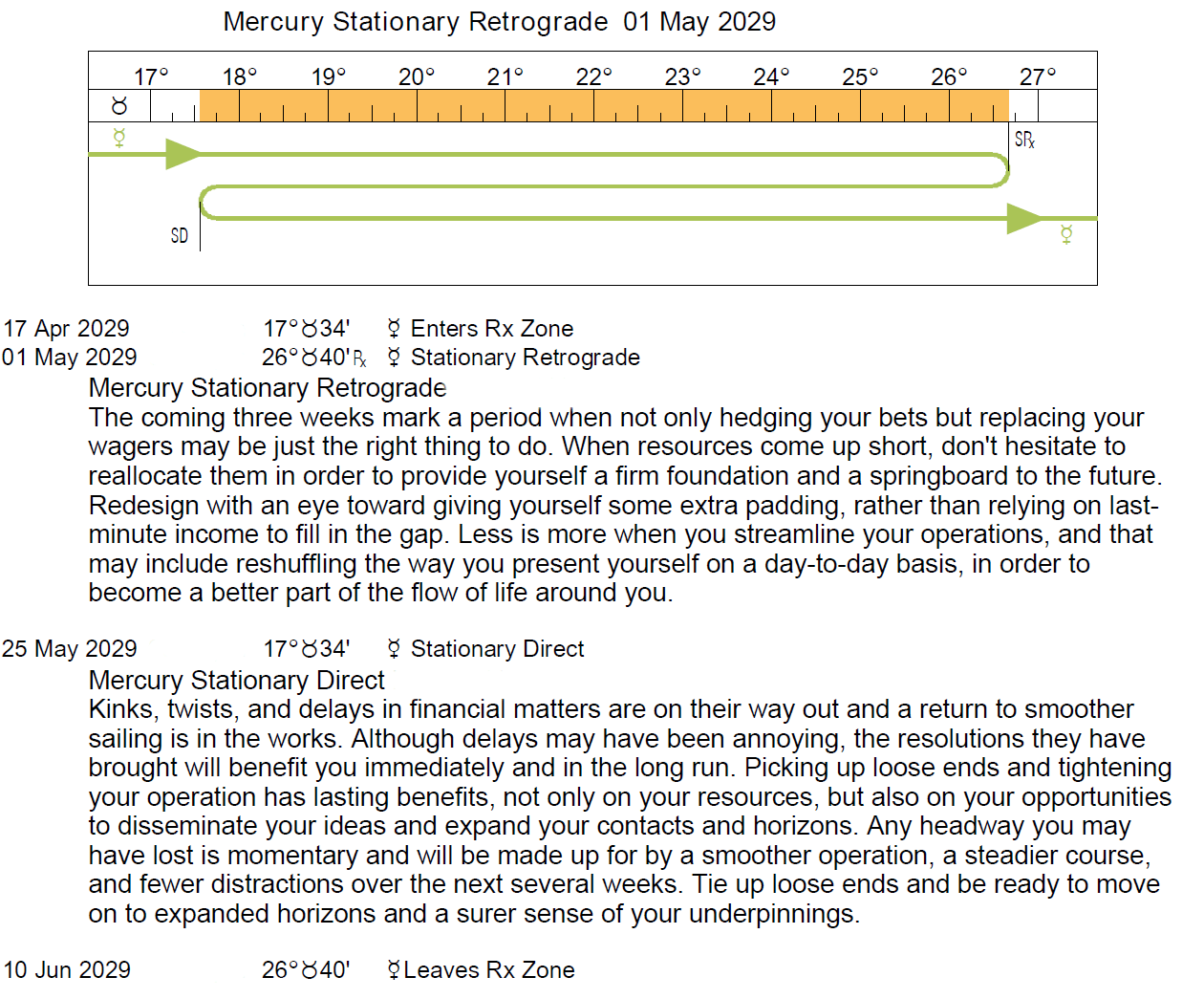 - On June 10, 2029, Mercury leaves the Retrograde Zone (post-retrograde zone) at 26° Taurus 40′