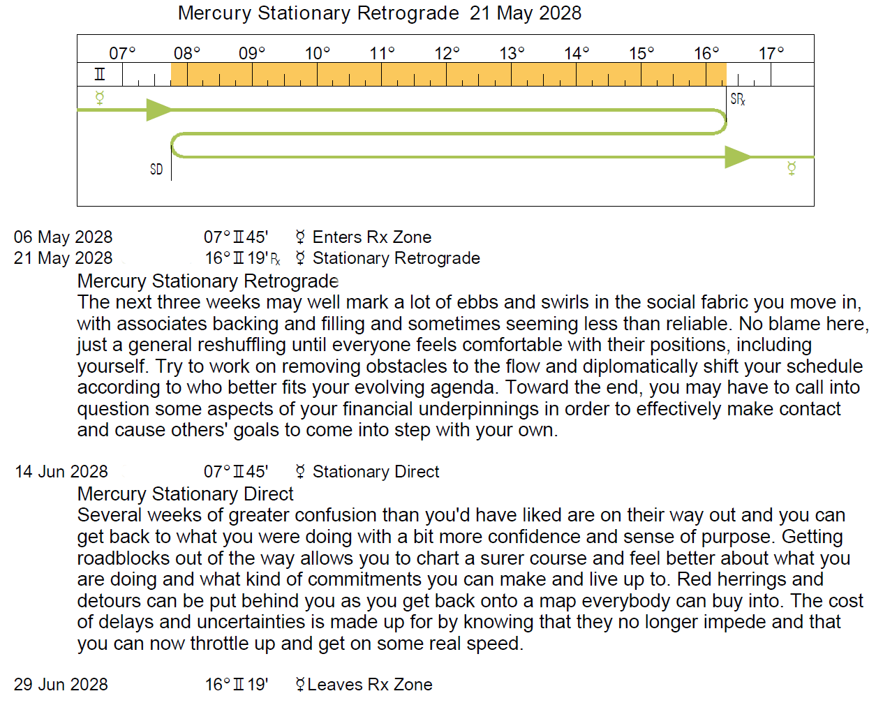 - On May 21, 2028, Mercury stations and turns retrograde at 16° Gemini 19’Rx