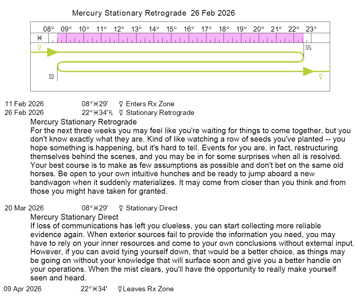 - On February 26, 2026, Mercury stations and turns retrograde at 22° Pisces 34′ Rx