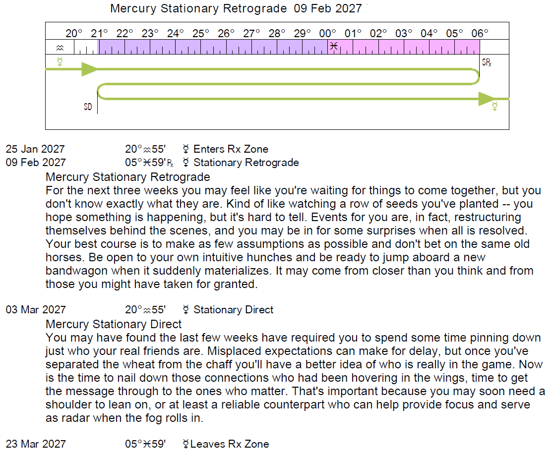 - On February 9, 2027, Mercury stations and turns retrograde at 5° Pisces 59′ Rx