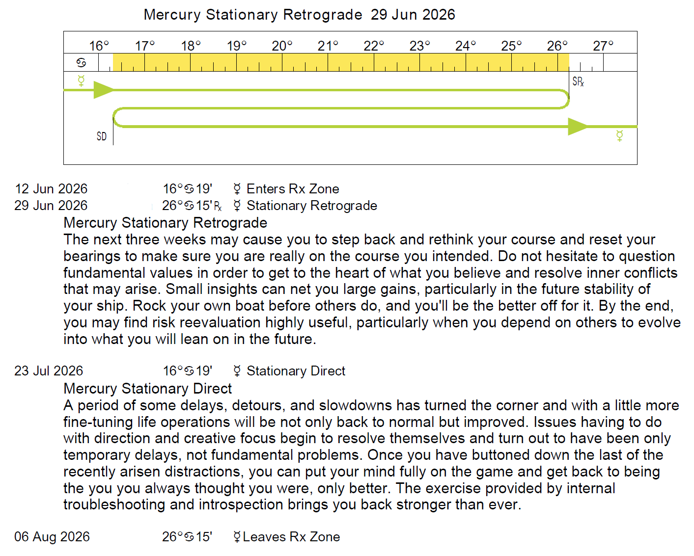 - On June 29, 2026, Mercury stations and turns retrograde at 26° Cancer 15’Rx