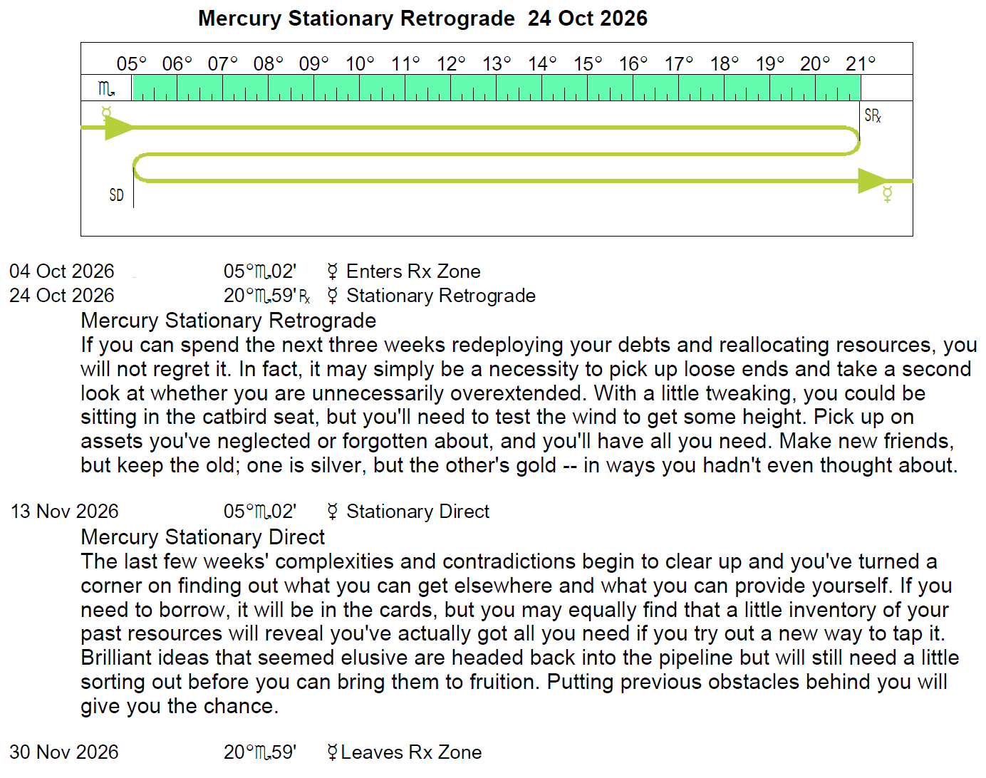 - On October 24, 2026, Mercury stations and turns retrograde at 20° Scorpio 59’Rx