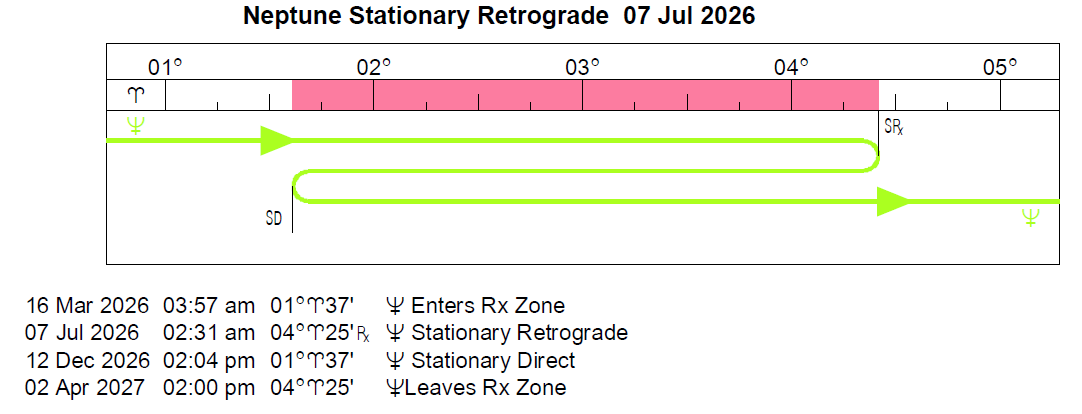 - Neptune stations and turns retrograde on July 7, 2026, at 4° Aries 25′ Rx