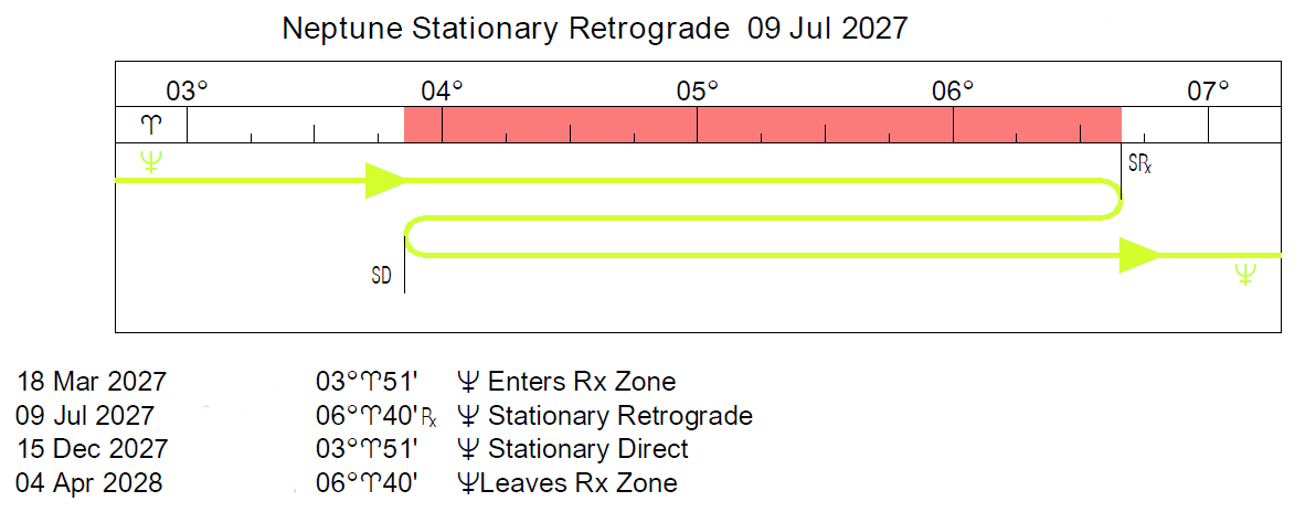 - Neptune enters the Retrograde Zone on March 18, 2027, at 3° Aries 51′