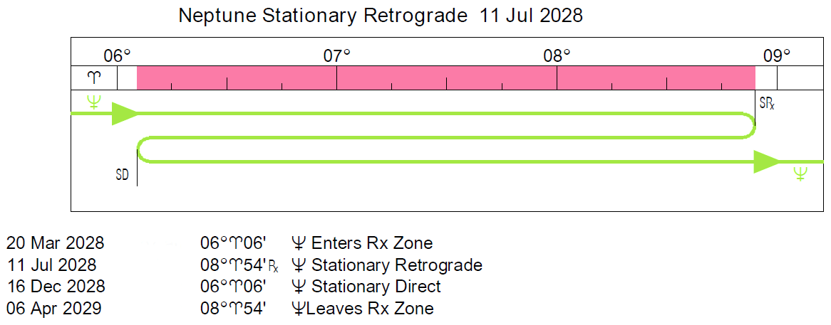 - Neptune enters the Retrograde Zone on March 20, 2028, at 6° Aries 06′