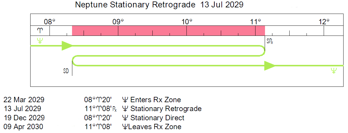 - Neptune enters the Retrograde Zone on March 22, 2029, at 8° Aries 20′