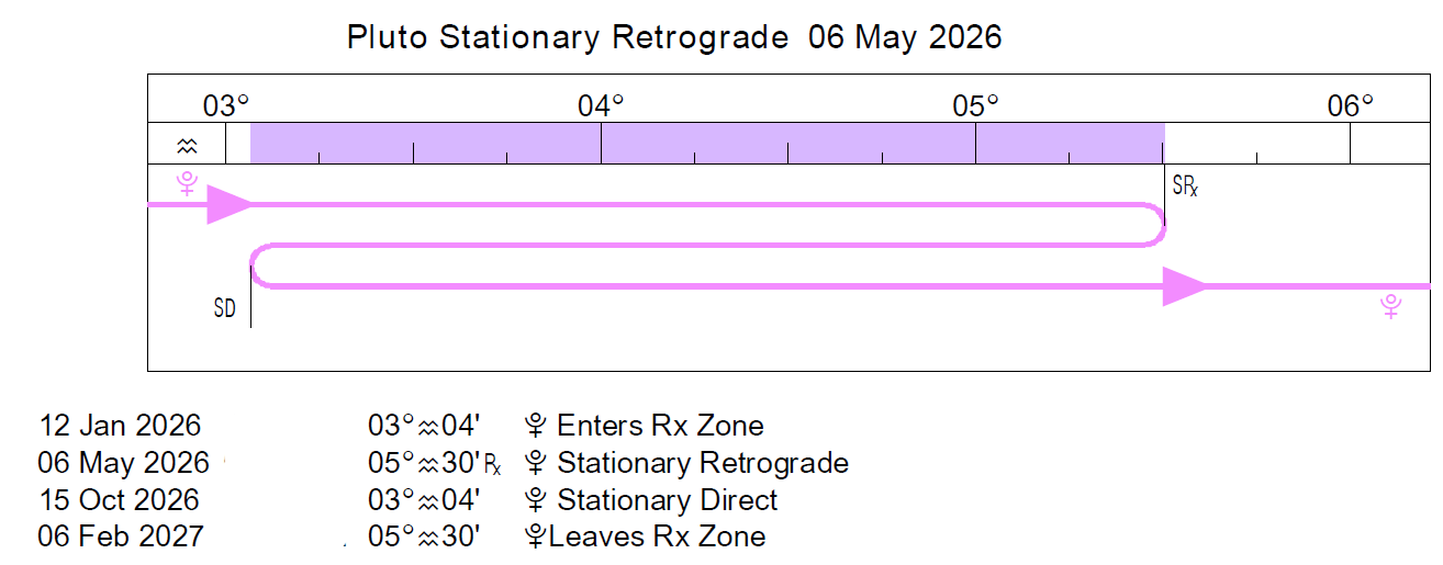 - Pluto enters retrograde zone/shadow on January 12, 2026, at 3° Aquarius 04′