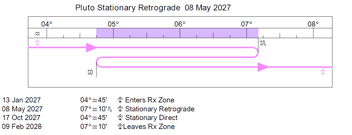 - Pluto stations and turns retrograde on May 8, 2027, at 7° Aquarius 10′ Rx