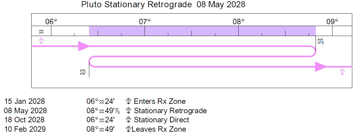 - Pluto leaves retrograde zone/shadow on February 9, 2028, at 7° Aquarius 10′